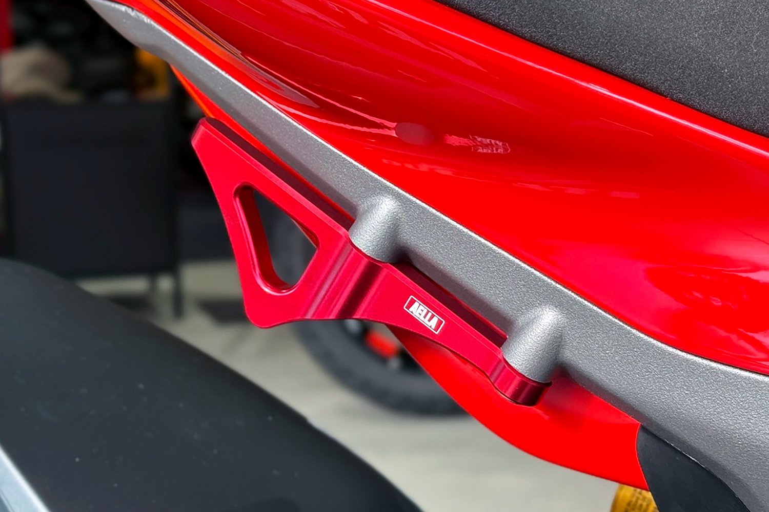 Tie down hooks for strapping the Ducati Streetfighter V4 for transporting on flat bed trucks. The tie down hooks allow ratcheting of the bike for safe transport.