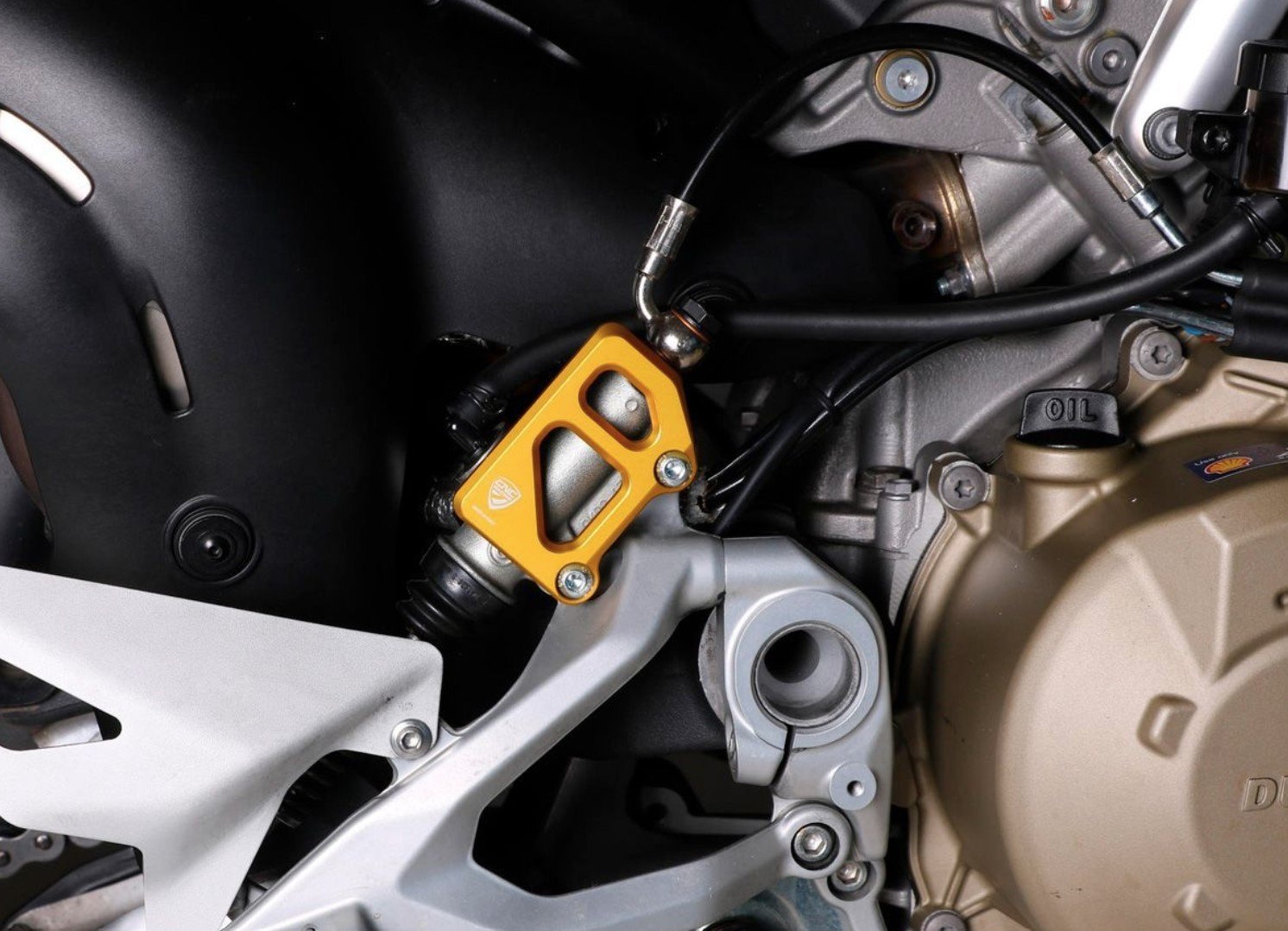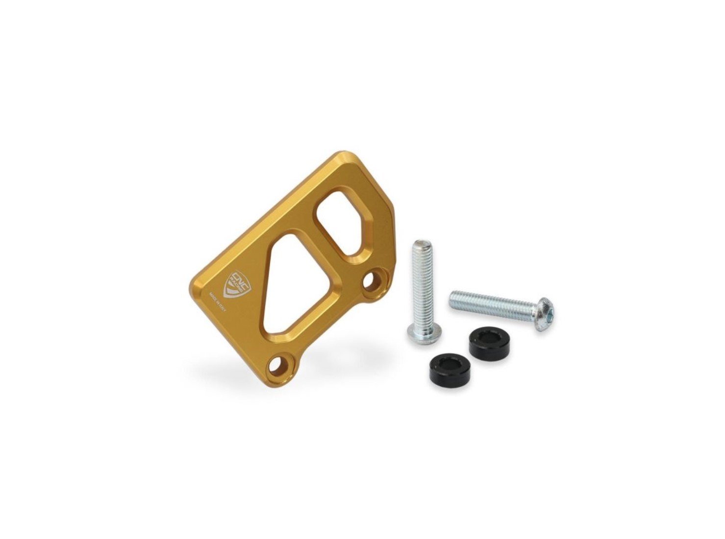 Master cylinder protection compatible with OEM footpegs.Ā Rear brake master cylinder protection machined from solid light alloy with subsequent surface anodization.